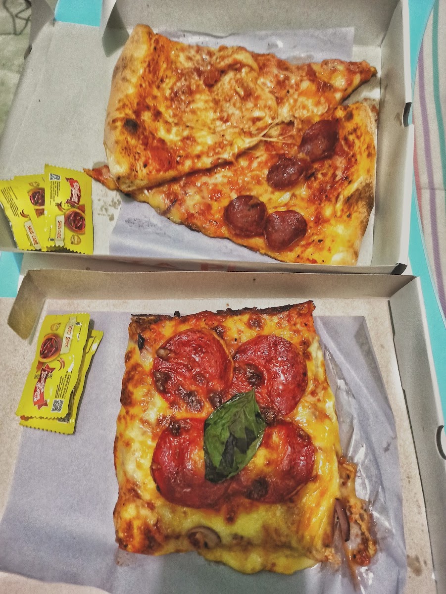 Unexpectedly, this place has a really good pizza. For me, this is the most delicious pizza in Surabaya. The pizza at this place is large with a diameter of about 50 cm and is sold per slice. I bought 3 slices with different flavors - mushroom & ham, white pizza and pepperoni. All have crunchy crackers. Everything is delicious!!. But what I like the most is the mushroom & ham pizza. Here I also buy bottled passion fruit juice. Fresh and original taste but expensive!. For pizza fans, this place is a must visit. Indeed, the room is small and hot because the kitchen is integrated into the customer's living room. But there are also outdoor places available for those who want to enjoy pizza outdoors. Yes, because the place was already crowded, I had to take them away.